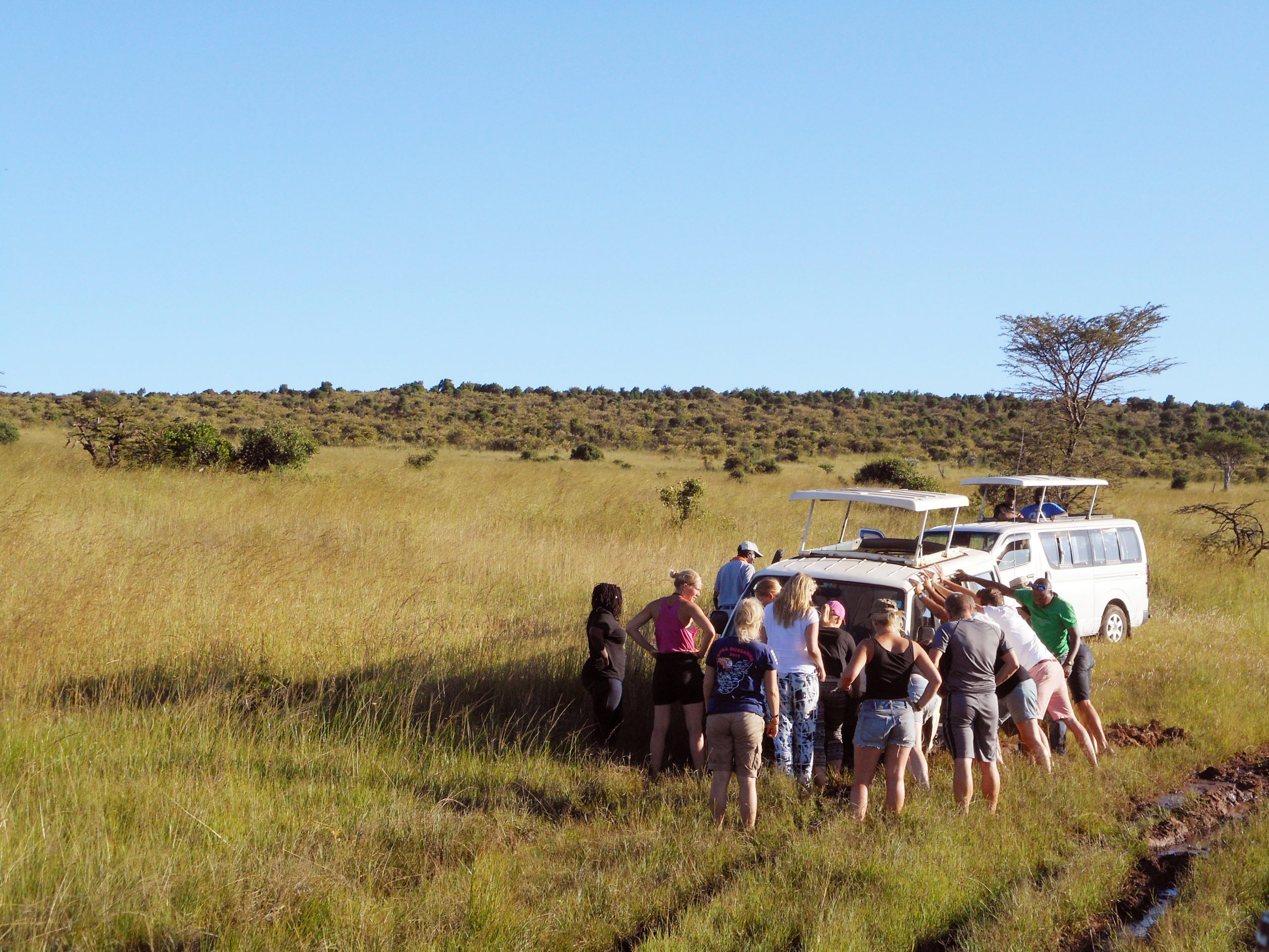 När vår bil körde fast i Masai Mara, Kenya, 2015. Vi kom inte loss och alla 20-ish fick knö ihop sig i bilen bakom för att hinna ut ur parken innan skymning…