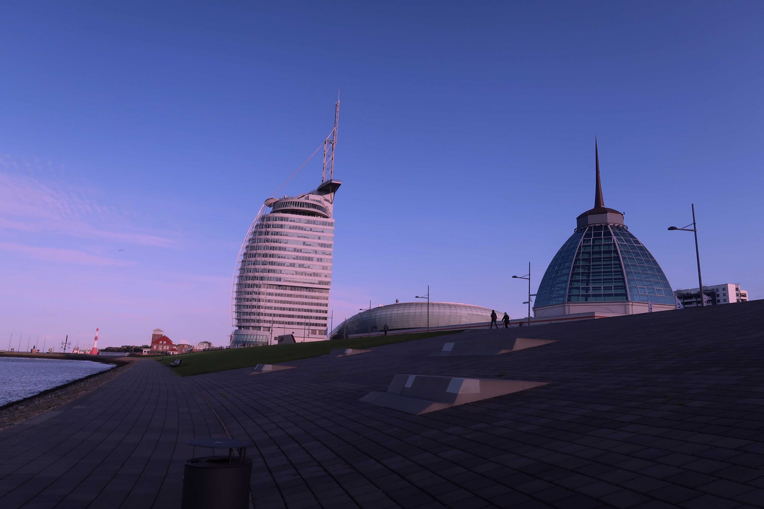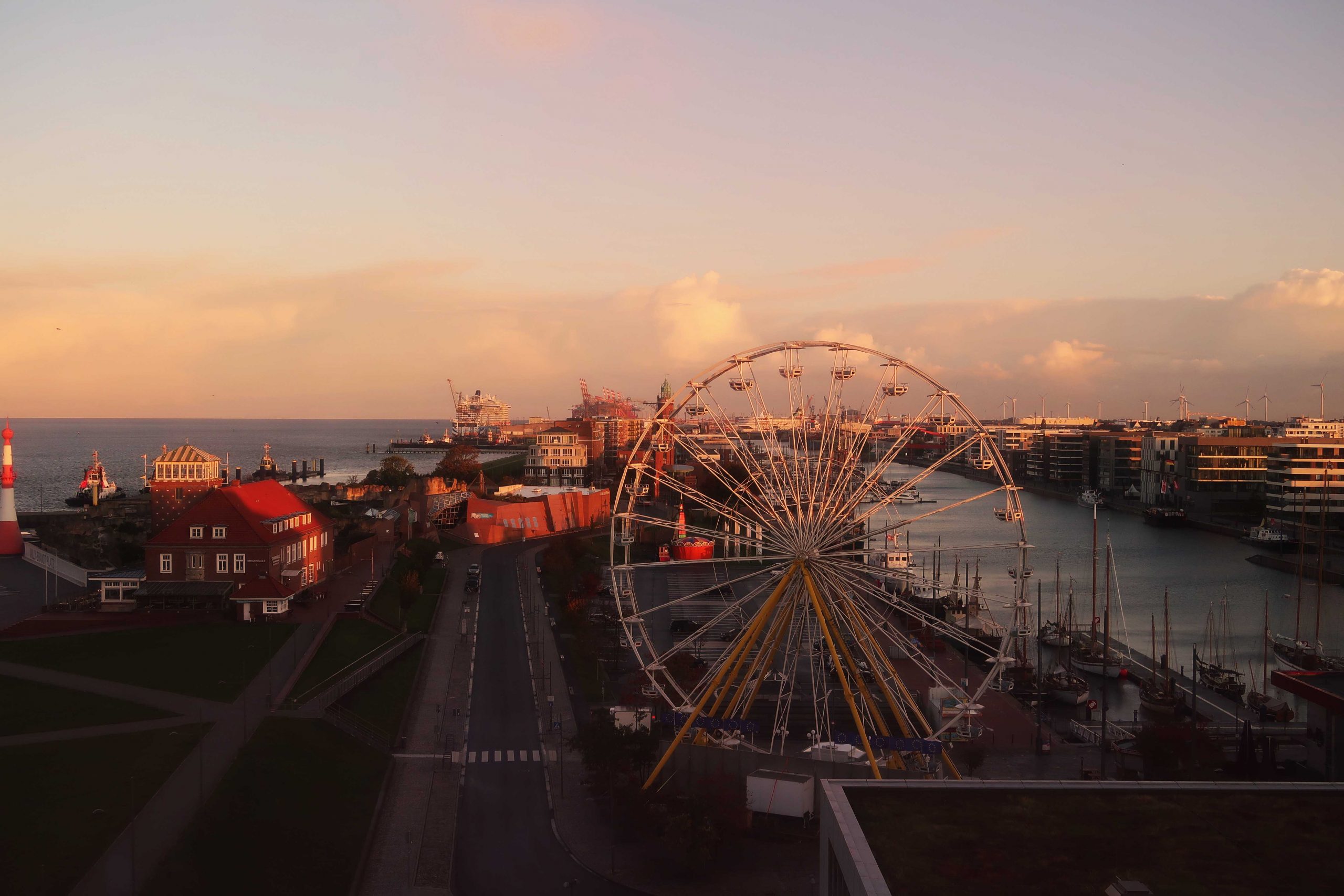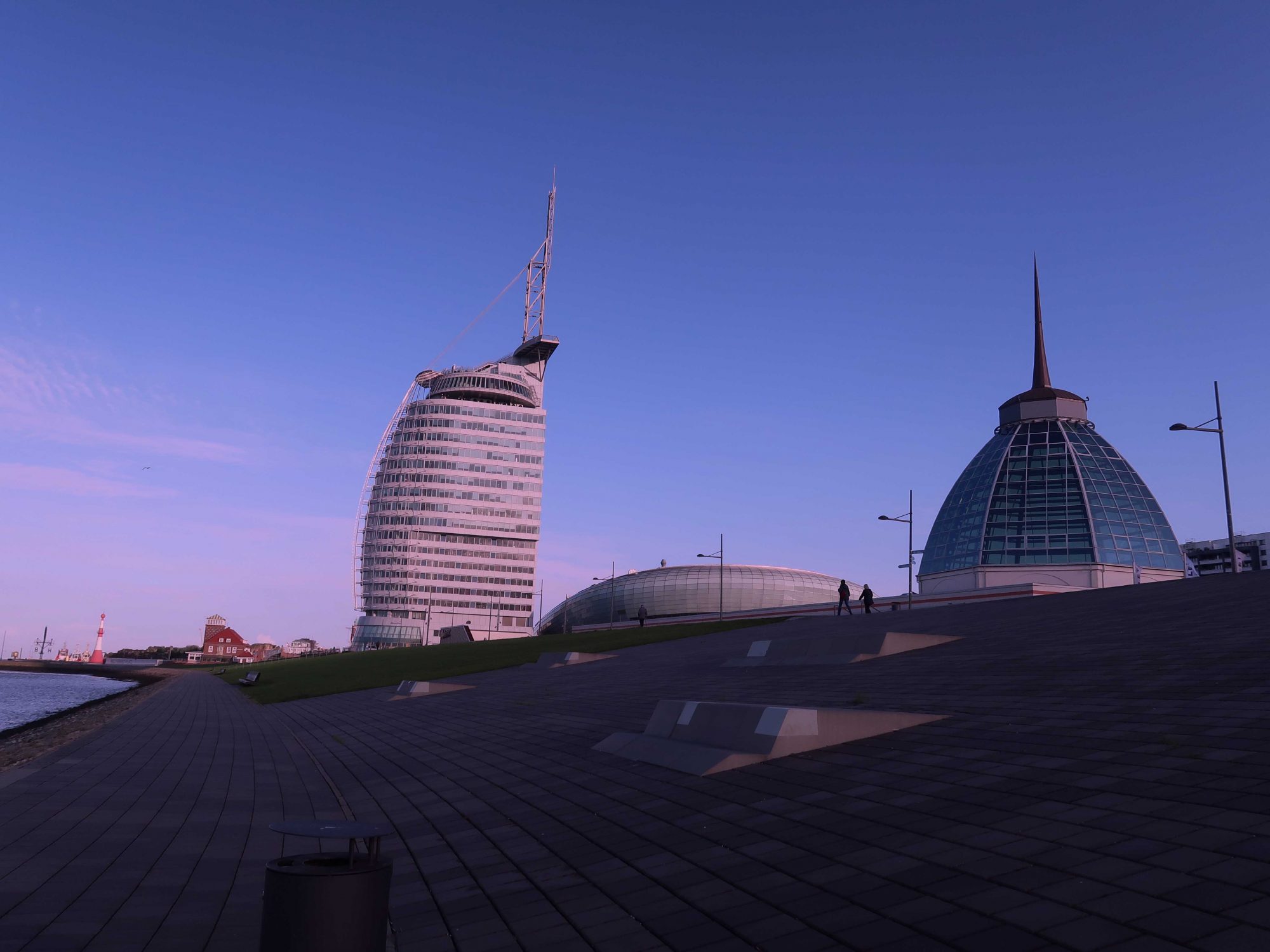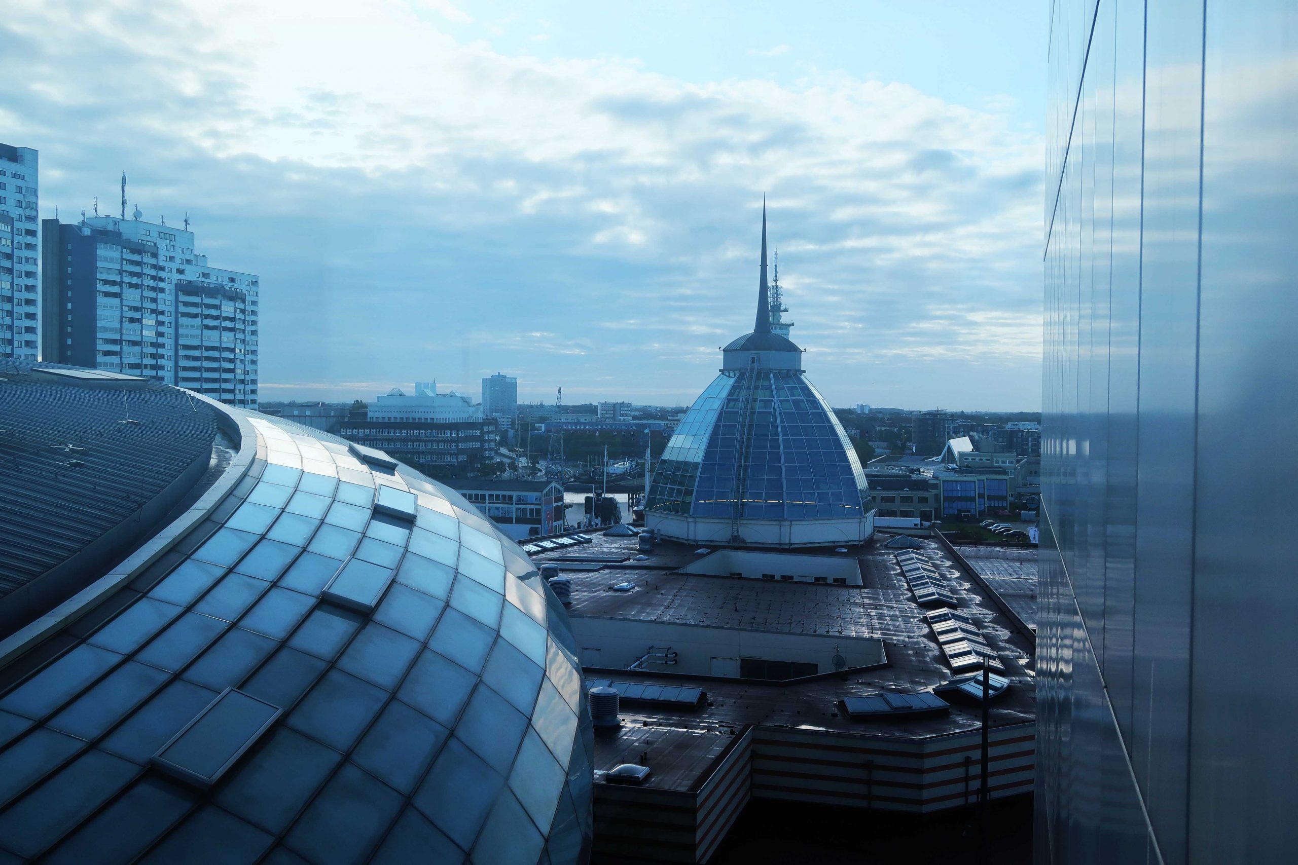Bor du här bor du praktiskt taget i en av Bremerhavens främsta turistattraktioner. På 20:e våningen, 77 meter upp i luften har du fantastiskt utsikt över havet och staden. Mitt rum var placerat på 6:e våningen med en imponerande utsikt från panoramafönstren över havet, hamnen, pariserhjulet, Klimahuset och Utvandrarmuseet. Att både kunna gå och lägga sig och vakna till en sån view kan en ju lätt vänja sig vid.